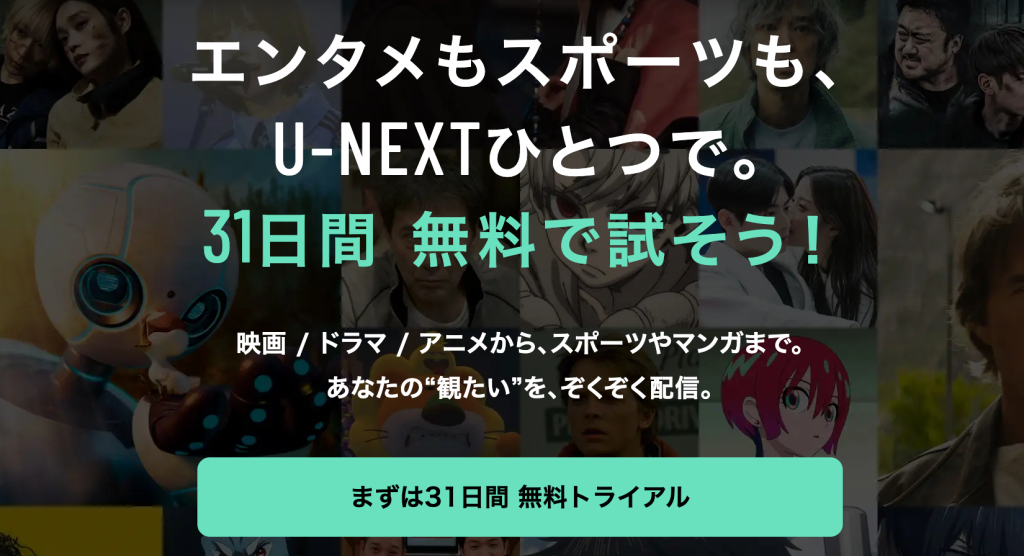 本作は完全無料で視聴することはできませんが、動画配信サービスの無料トライアルを活用すれば、実質無料で楽しむことが可能です。中でもU-NEXTは、31日間の無料期間とポイント付与によって、最もお得に視聴できるサービスといえるでしょう。